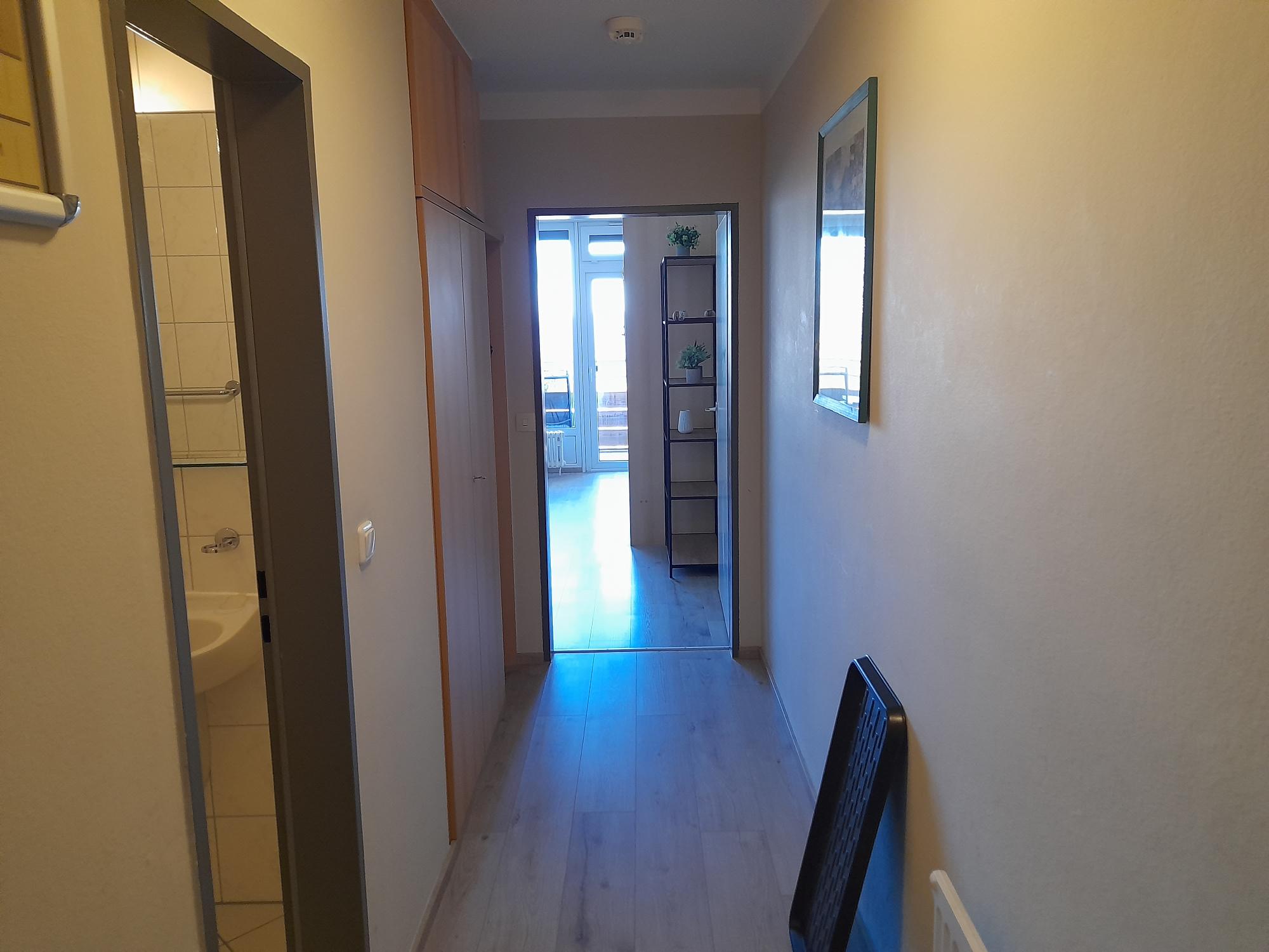 Der Flur öffnet sich zum Wohn-/Schlafraum, von wo aus Sie auf den Balkon gelangen.