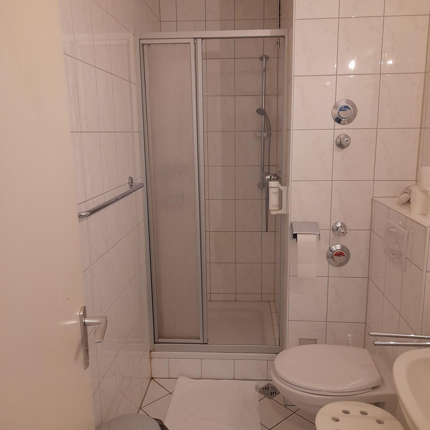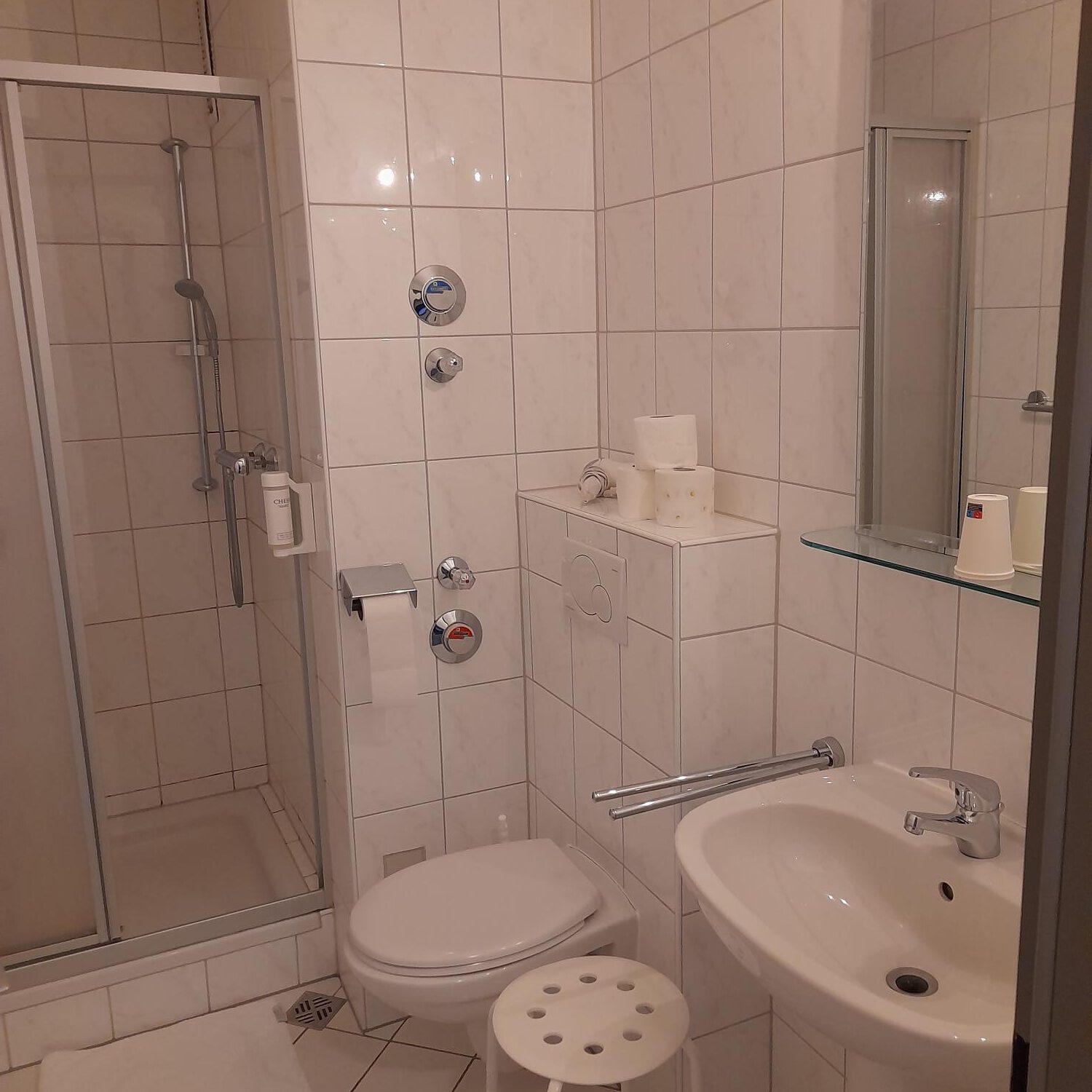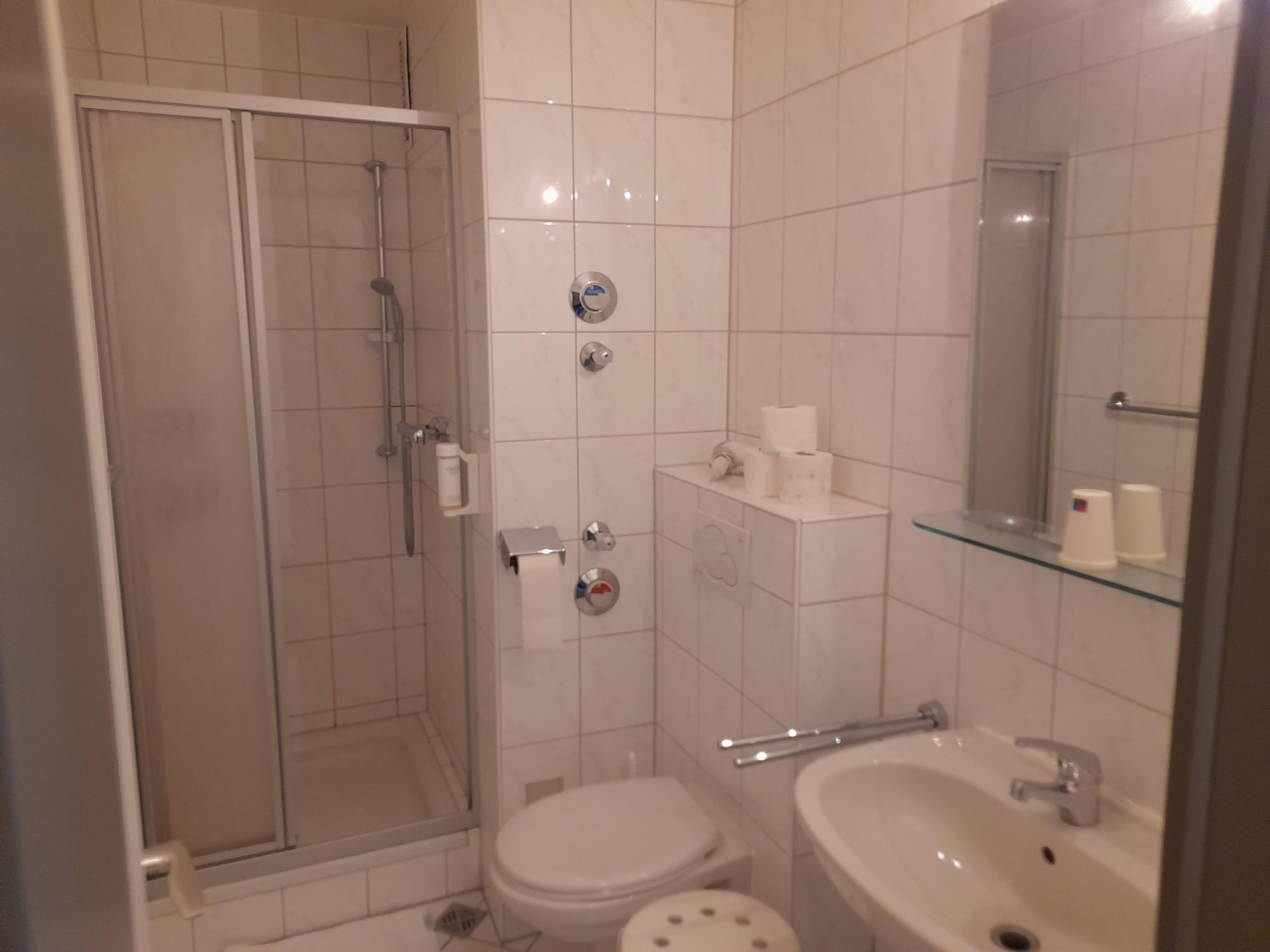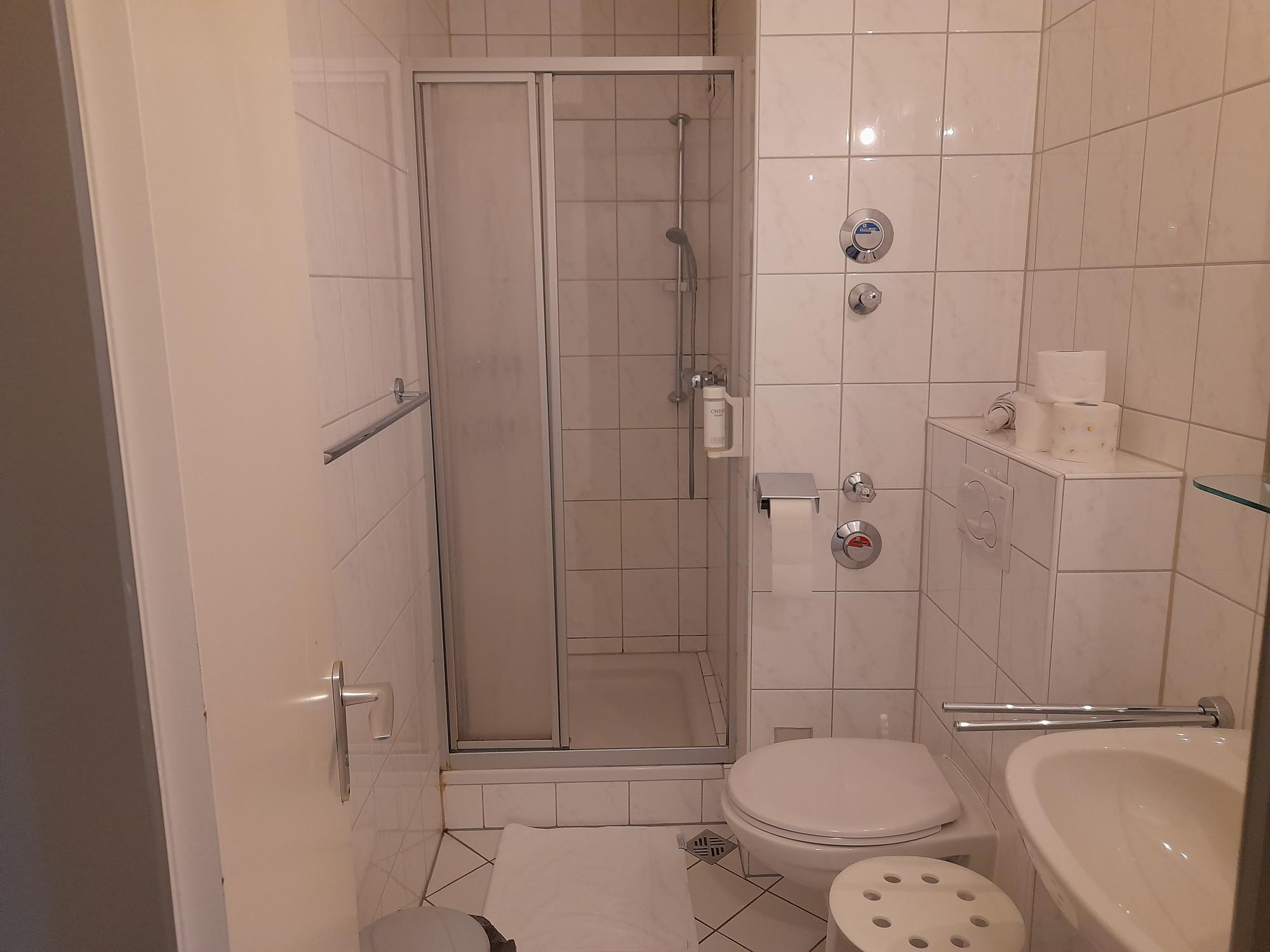 Weiter im Flur befindet sich linkerhand das innenliegende kleine Bad mit Dusche, Waschbecken und Toilette.