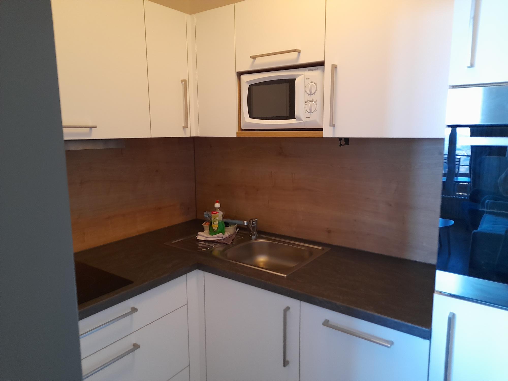 Vom Wohn-/Schlafraum geht es weiter zur innenliegenden kleinen Küche mit EBK.